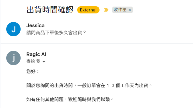 儲存後,當客戶來信詢問常見問題時,Ragic AI 會自動回覆對應內容。