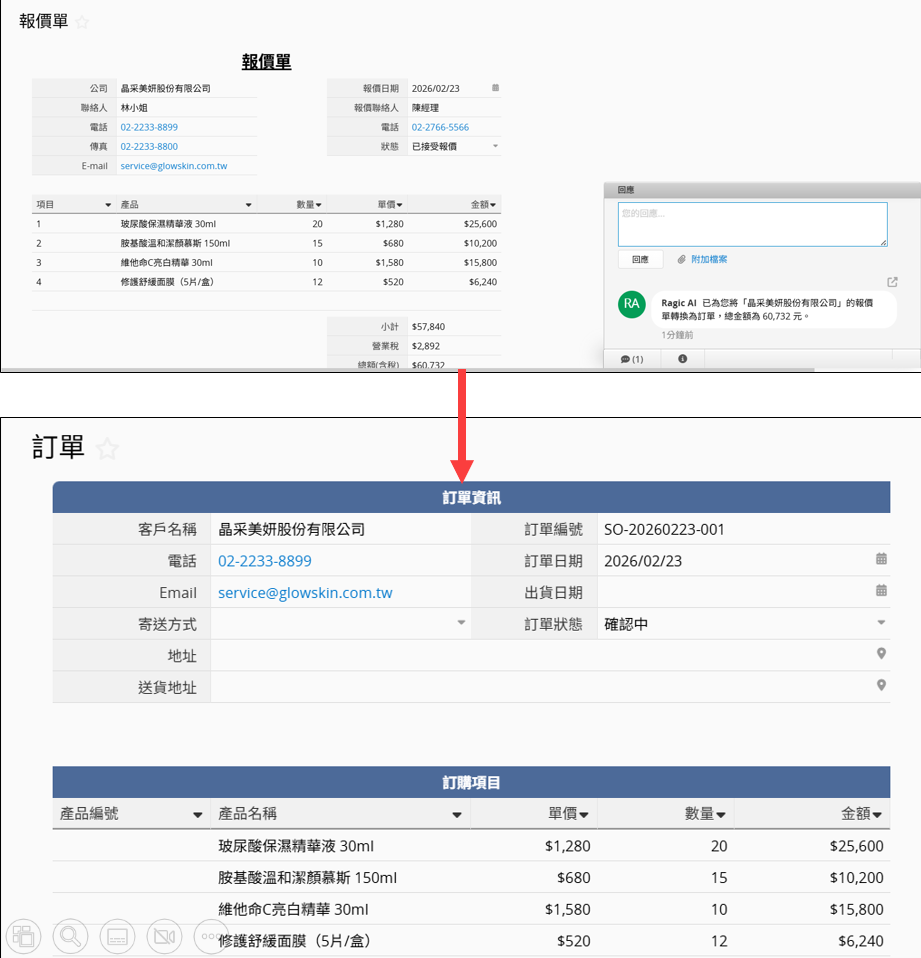 當「報價單」狀態為「已接受報價」時,根據報價單內容在「訂單」中新增一筆資料,並將狀態設為「確認中」。