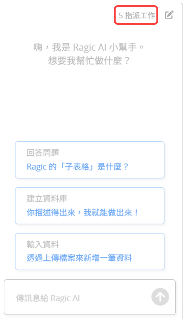 Ragic AI 視窗右上角可查看目前已指派的任務數量。