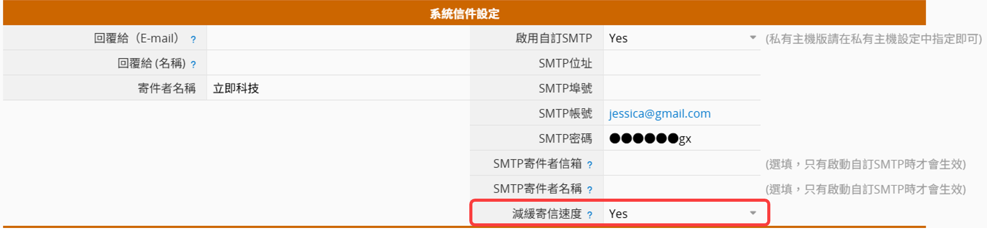 另外,也可以設定減緩寄信速度,設定為 Yes 之後,系統會以每分鐘少於 30 封信的速度發信,避免觸及部分 SMTP 供應商的速率限制,導致 SMTP 帳號會有暫時被封鎖而無法順利發送信件的問題。