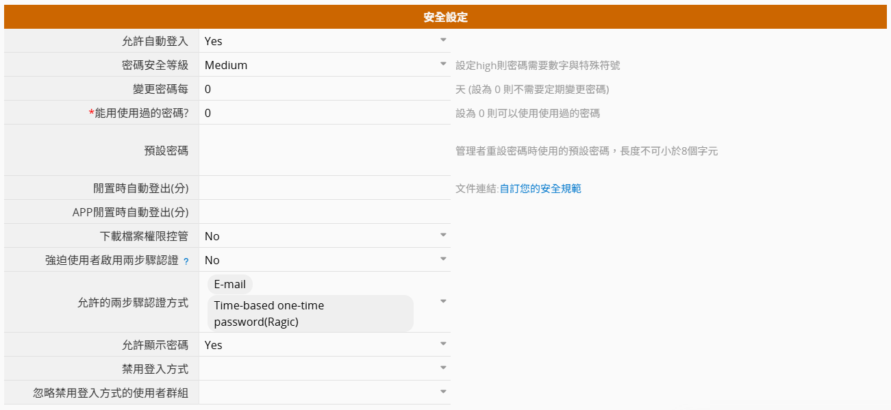 可以針對網頁及 APP 設定時間,Ragic 將會在指定的閒置時間後幫使用者登出。而要是不需要此設定的話則在此欄位輸入 0 或是空白即可。