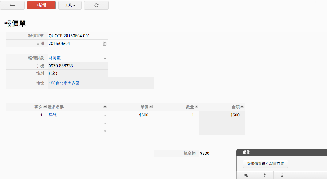 使用者按了剛才新增的按鈕後,就會把此筆「報價單」的內容,依據對應設定,新增複製到「銷售訂單」中。