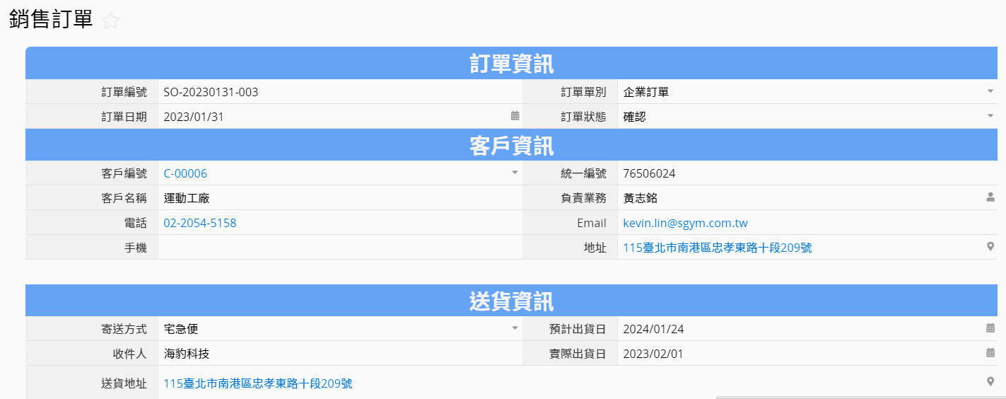 點擊按鈕後,「銷售訂單」就會新增一筆資料,內容是從執行按鈕的那一筆「報價單」資料拋轉過來的。可以看到不僅一般欄位的資料可以被拋轉,子表格中的項目也一併拋轉了。
