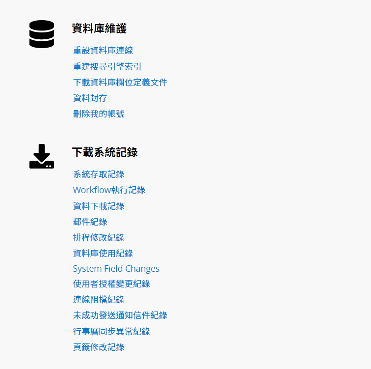 | Workflow 表單公式重算執行時間紀錄 | 列出每一張表單執行每日公式重算所需時間紀錄,如果沒有紀錄則不會顯示任何內容。 |