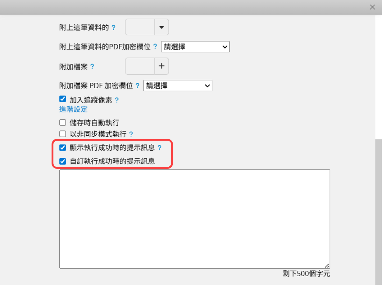 另外也可以勾選自訂執行成功時的提示訊息,下方會出現訊息輸入欄位可以輸入自訂的提示訊息,請留意字數限制。