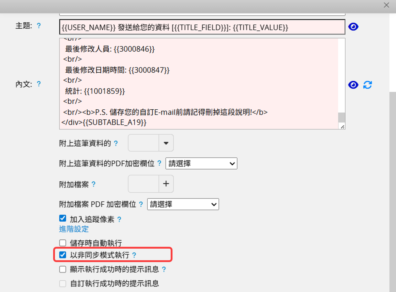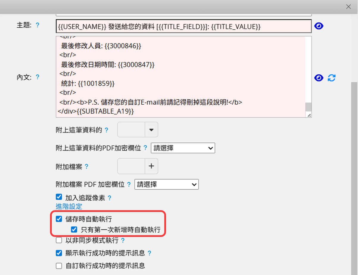 在進階設定中可以勾選儲存時自動執行。預設只有第一次新增時自動執行寄出自訂信件,若希望每次儲存資料(包括新增及修改資料)都自動寄出信件的話,可以取消勾選此設定。