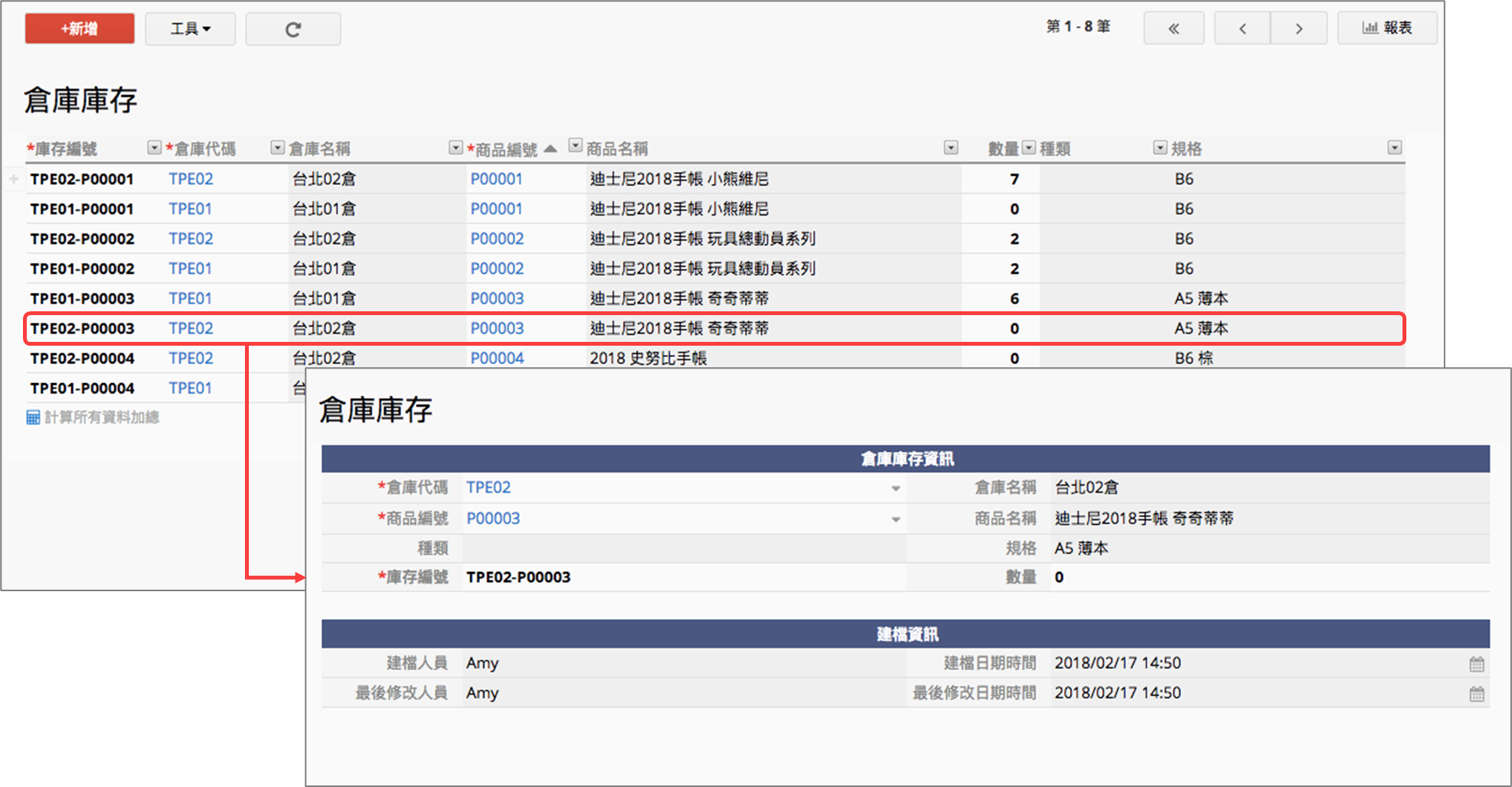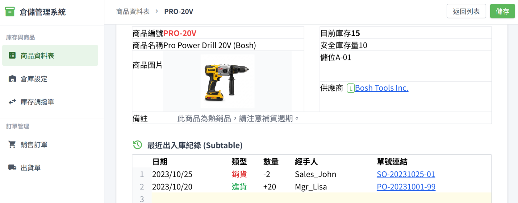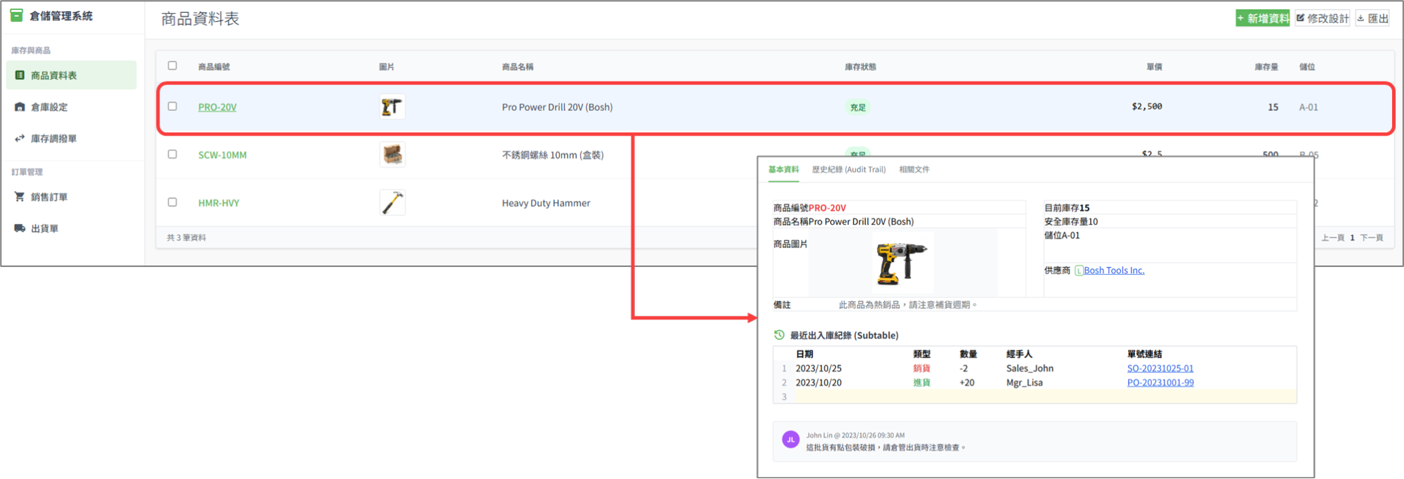 但在庫存管理系統中,其實這樣的操作簡單很多——你可以直接在每一個物品的庫存資料上,直接看到它的出入庫紀錄,讓你追溯每一個庫存數字到底是怎麼計算的,確保每一次變動都「有所本」,保障你對庫存數字的安全感。