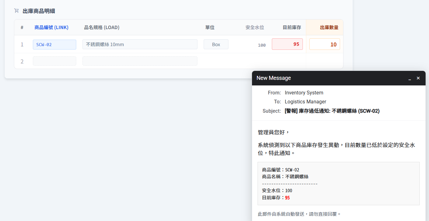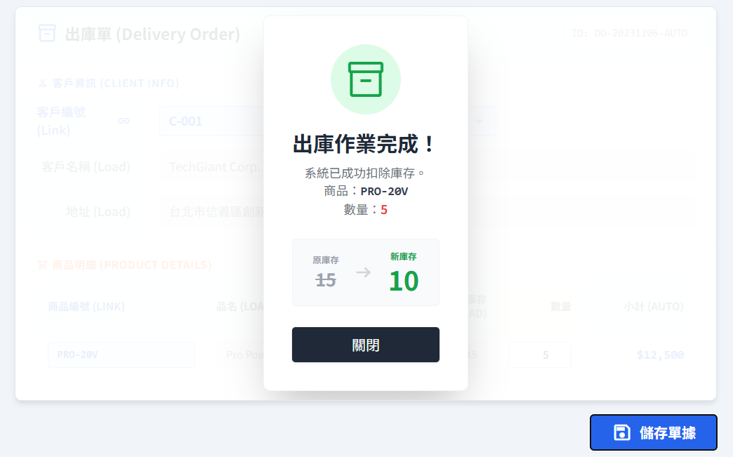 並且在完成出庫單的填寫之後,按一顆按鈕就自動將庫存的數量更新回去。