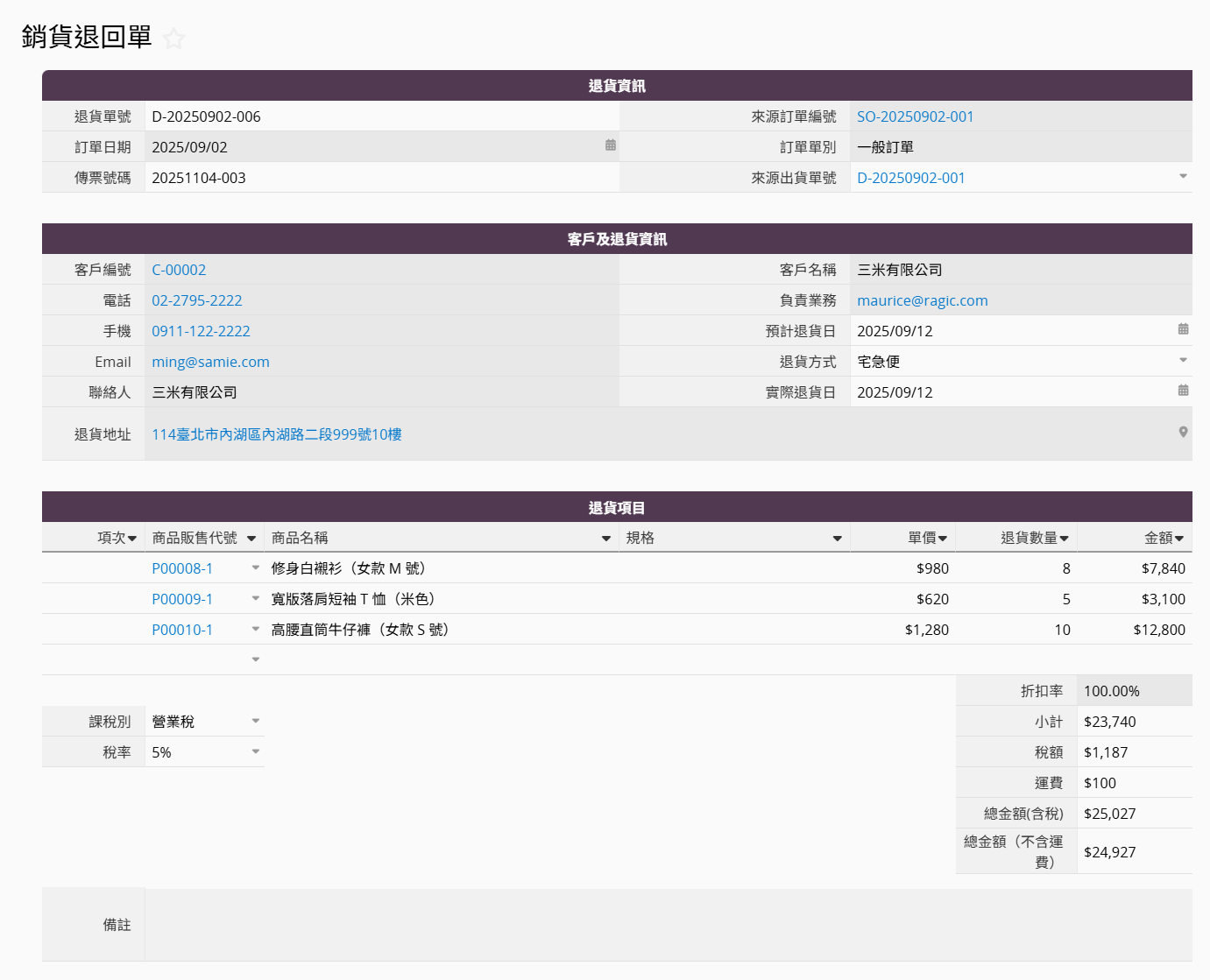當客戶發現商品有瑕疵、收到錯誤商品,或希望取消訂單時,通常會以原始銷售訂單為依據,來提出退貨申請。收到退回商品後,企業會檢查商品是否與原訂單一致,並確認退貨原因。庫存數量會隨之更新,來反映退回的商品,財務紀錄則會做調整,處理相應的退款或折抵。銷退單可作為稽核、會計與客服的正式記錄。