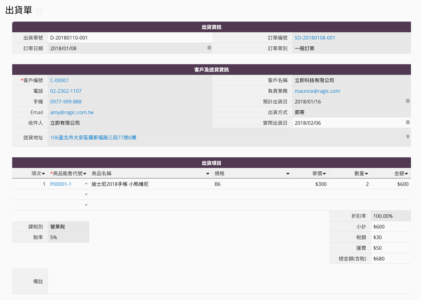 出貨單通常包含以下資訊: