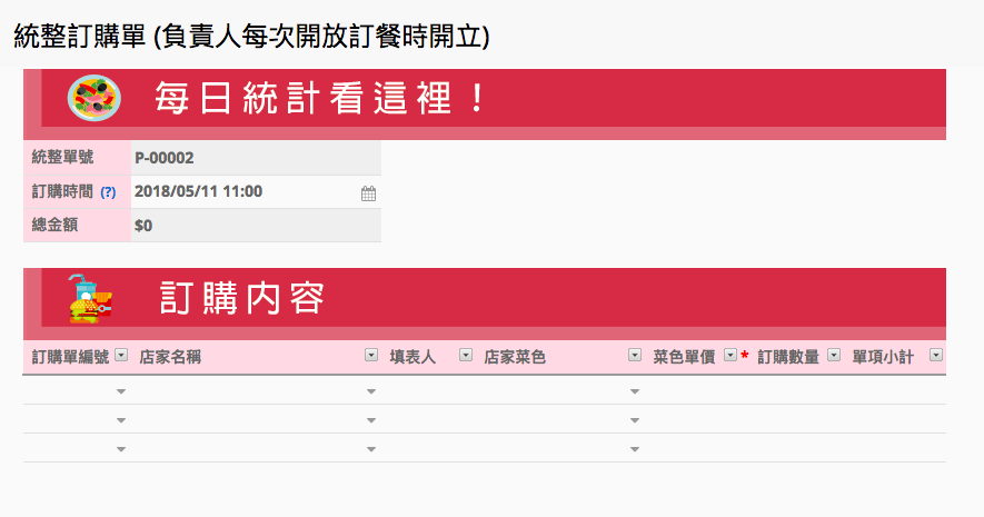 每天負責人要開放訂便當時,在「統整訂購單」建立一筆資料,填寫「訂購時間」,就能建立當日資料。訂購時間可以讓訂購人點選,區分這是哪一天、哪一餐的訂購資料。